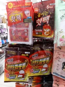 Hot packs in Korea tend to cost about 1,000 won and are extremely popular. They come in a variety of sizes and time frames they’ll work for. Look for the number on the package next to 시, example 12시 means the heat pack should work with continuous heat for 12 hours. They can be taped onto clothing or can purchased with sticky side. Don’t stick them directly to your skin as they do get hot. Just open them up, shake and pop one into a pocket or your shoes to keep warm. These can be purchased almost anywhere.